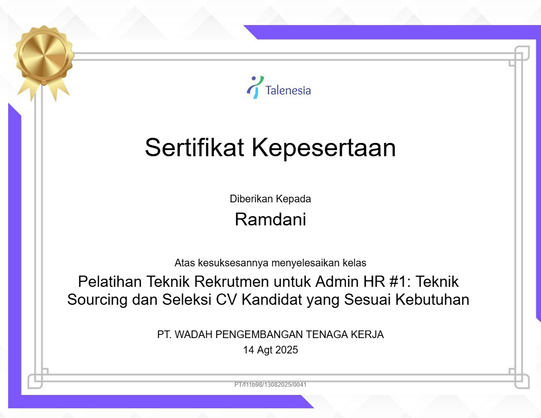 Pelatihan Teknik Rekrutmen untuk Admin HR 1: Teknik Sourcing dan Seleksi CV Kandidat yang Sesuai Kebutuhan |